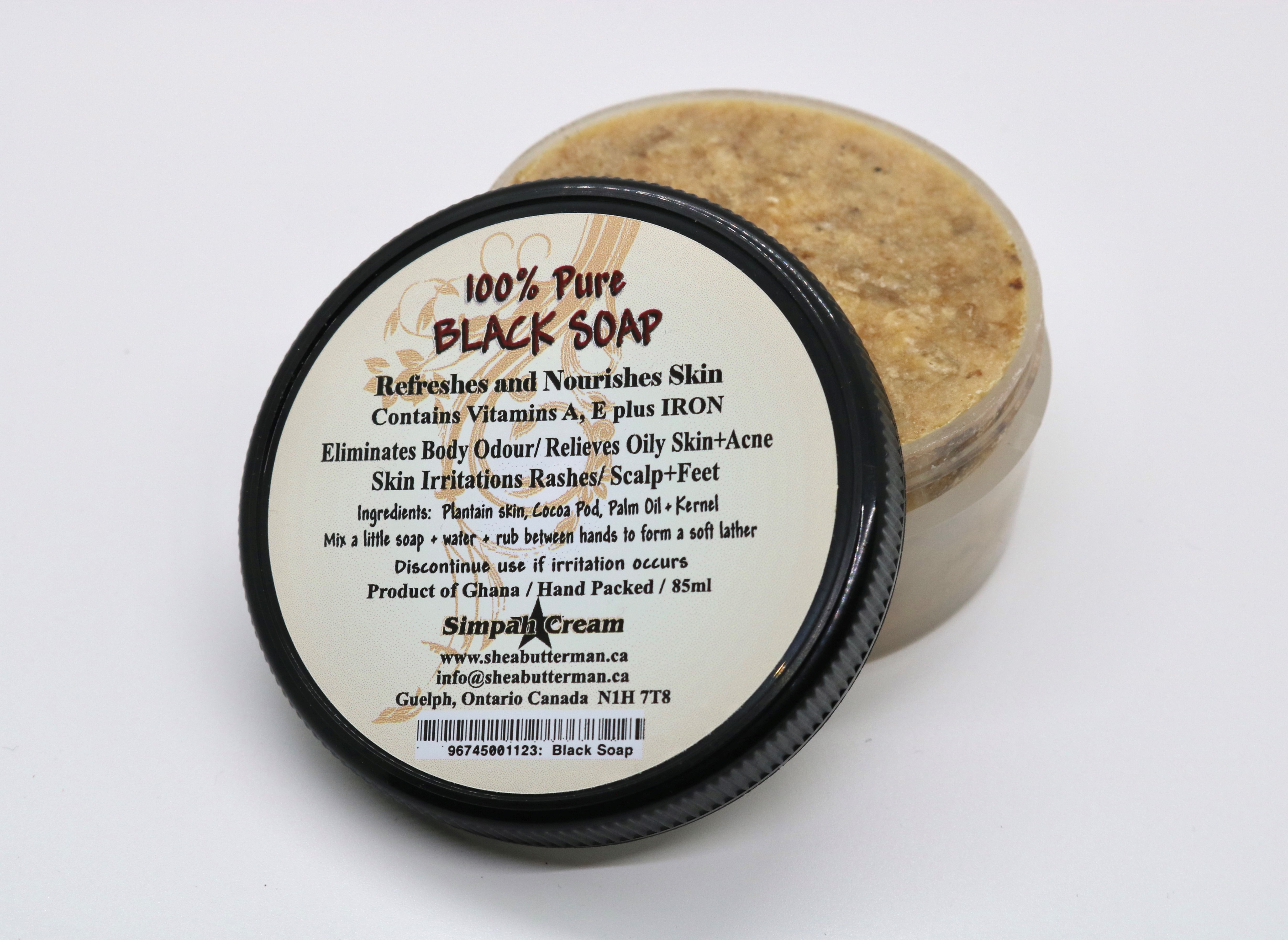 Refreshes and nourishes skin. Eliminates body odour, relieves oil skin, acne, skin irritations and rashes. Ingredients include plantain skin, cocoa pod, palm oil, and palm kernel. No fragrance is added. Mix a little soap with water and rub between hands or onto a washcloth to create a soft lather.